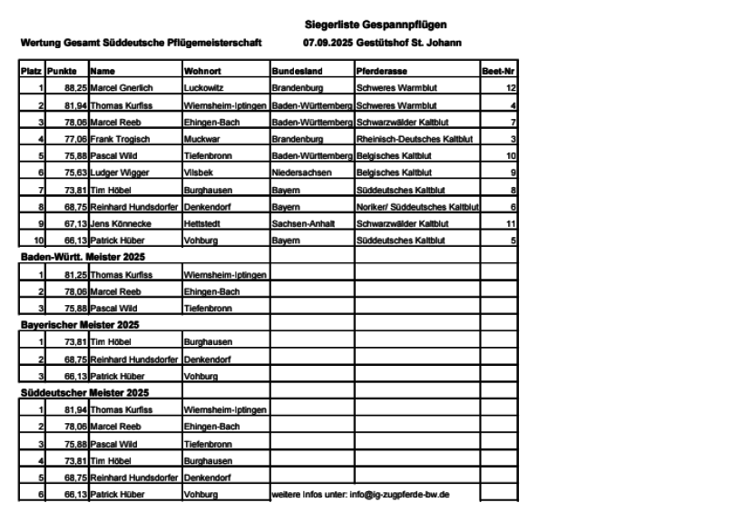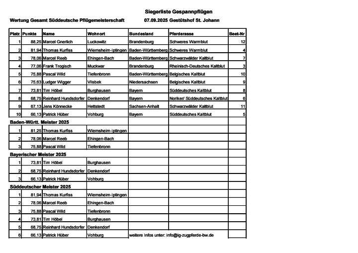 Die Süddeutsche Meisterschaft im Gespannpflügen auf dem Gestütshof St. Johann war eine gelungene Verbindung aus Leistung, Handwerk und kooperativer Verbändearbeit. Ein würdiger Rahmen für spannende Vergleiche und wertvolle Erfahrungen für alle Beteiligten.