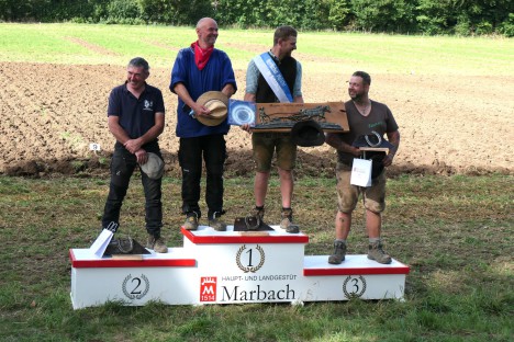 Mit dabei war der amtierende Deutsche Meister Thomas Kurfiss, sowie der amtierende Europameister Marcel Gnerlich, mit der weitesten Anreise aus Brandenburg. Die Anlage des Gestütshofes bot ideale Bedingungen mit fast ebenem Untergrund, gut vorbereitetem Boden und ausreichendem Platz für die zahlreichen Zuschauer. Der Wettkampf startete mit dem Einmarsch der zehn Gespanne, die dann vor den zuvor ausgelosten Beeten ihren Platz einnahmen. Die Grußworte zur Veranstaltung wurden von der stellvertretenden Gestütsleiterin Frau Dr. Eiberger, dem Bürgermeister von St. Johann Herrn Florian Bauer sowie dem Landrat Dr. Ulrich Fiedler gesprochen. Frau Dr. Eiberger hatte noch die besondere Ehre das Grußwort des Ministers für Ernährung, Ländlichen Raum und Verbraucherschutz Baden-Württemberg Herrn Peter Haug zu verlesen. Auch das Bayrische Staatsministerium für Ernährung Landwirtschaft und Forsten unterstützte die Veranstaltung. Um kurz nach 13:00 Uhr startete die Meisterschaft, und die Gespanne stellten sich in Reih und Glied an ihren Beeten auf. Der Landrat gab das Startzeichen und die Pflüger begannen mit der ersten Herausforderung, der Spaltfurche. Vollkommen durchgeschnitten, sauber und gleichmäßig soll sie aussehen. Fast schon Zeitlupenhaft ging es an das obere Ende des Pflügebeets, und nach kurzer Anpassung und leichten Veränderungen der Pflüge, wieder zurück zur Anfangsfurche. Jetzt hieß es erst einmal abwarten, denn die Richter mussten von jedem Pflüger die Spaltfurche genau bewerten. Wie die Teilnehmer war auch das Richterteam bunt gemischt. Aus Baden- Württemberg, Bayern und Brandenburg waren auf dem Feld Günther Klein, Michael Beckler, Günther Pissang, Martin Braun und Reiner Martin anwesend, um gründlich zu beurteilen was die Pflüger ablieferten. Regelmäßig wurde auch die Tiefe der Furchen gemessen. Es war eine Mindesttiefe von 10 cm ausgegeben worden, die nicht unterschritten werden durfte. Nach ungefähr 6 bis 8 Umläufen wurde dann vom Zusammenschlag auf den Auseinanderschlag gewechselt. Hier freute sich jeder Pflüger auf eine gerade Furche, die er von seinem Beetnachbarn übernehmen musste. Nach anderthalb Stunden hochkonzentrierter Pflügearbeit kamen die Teilnehmer dann nacheinander zur letzten Aufgabe, nämlich eine saubere Schlussfurche abzuliefern. Und auch hier zeigte sich das hohe Niveau der Teams die an diesem Wettkampf teilgenommen haben. Die Schlussfurchen machten allesamt einen sehr guten Eindruck. Moderator Martin Kemmler verstand es den ganzen Nachmittag die interessierten Zuschauer mit allerhand Fachwissen zu unterhalten. Er erklärte sehr genau die ackerbaulichen Leistungen, die auf den Beeten zu sehen war, und stellte jedes Gespann und deren Besitzer vor.